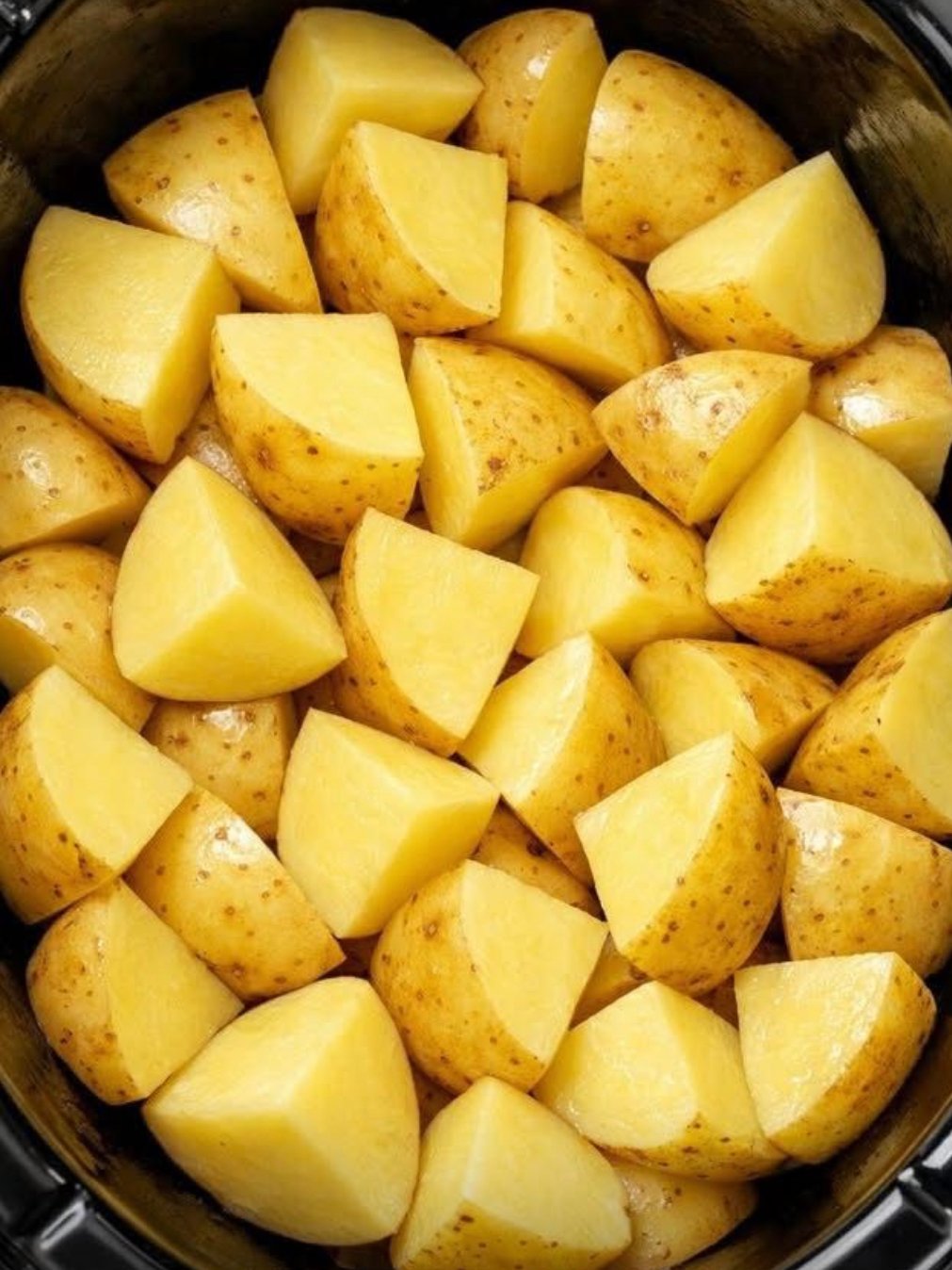 Place the raw quartered Yukon Gold potatoes in an even layer on the bottom of a 4- to 6-quart slow cooker. The potatoes should be in a single, fairly snug layer.