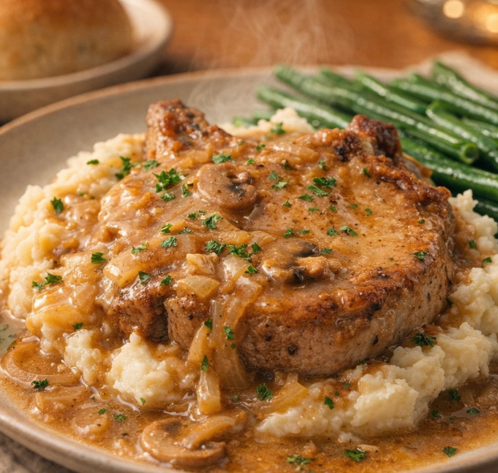 • These smothered pork chops over mashed potatoes or egg noodles with a side of green beans