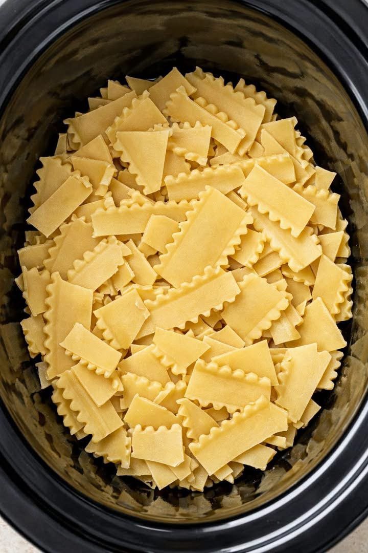 Dump the broken dry noodles into the slow cooker in an even, loose layer.