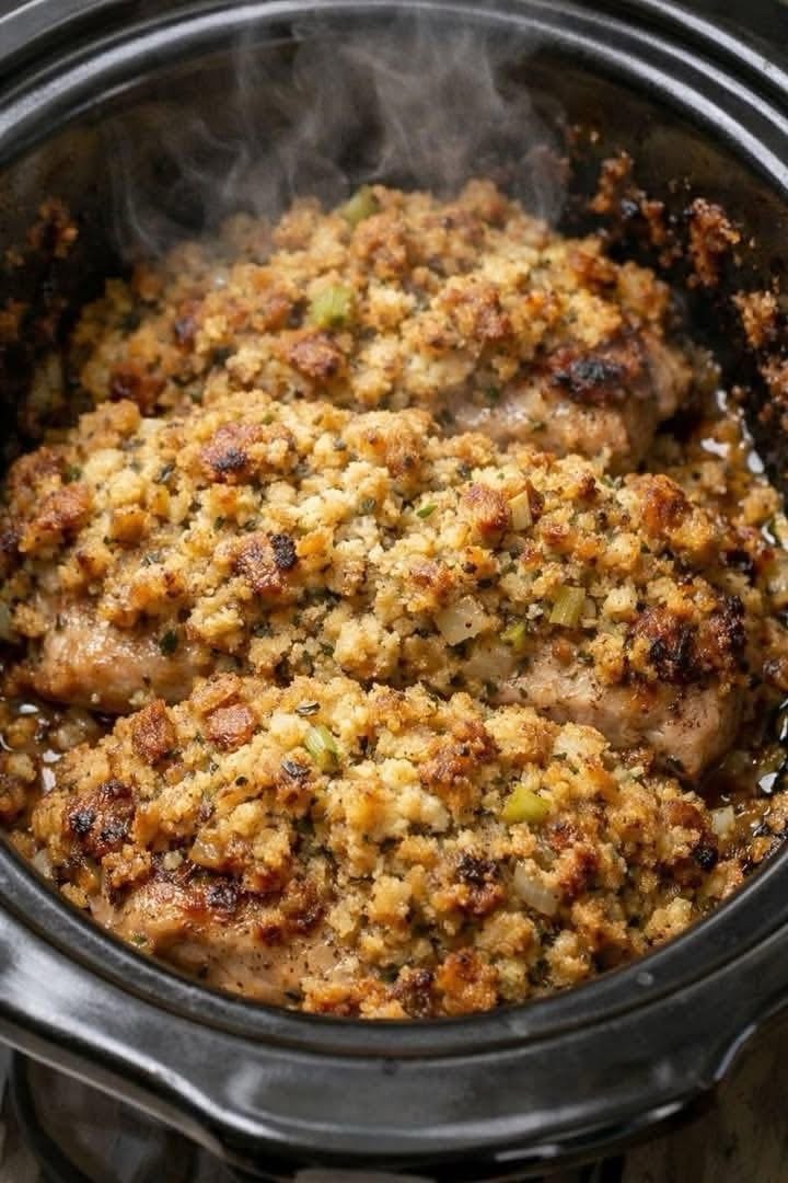 Yes. Sear the pork chops and prepare the stuffing as directed. Transfer the stuffing to a greased slow cooker. Nestle the pork chops on top. Cook on LOW for 4 to 5 hours or on HIGH for 2 to 3 hours. The stuffing will be softer than the baked version.
