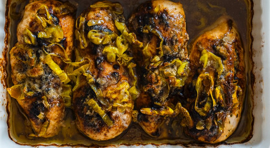 Pepperoncini and their brine add tanginess and a very mild heat. The brine also helps keep the chicken moist.