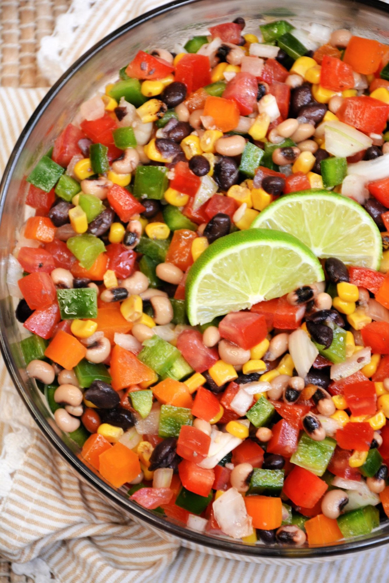 - Combine the base: In a large mixing bowl, add the black beans, black-eyed peas, corn, diced tomatoes, red and green bell peppers, red onion, jalapeño, and cilantro. Toss gently to mix.