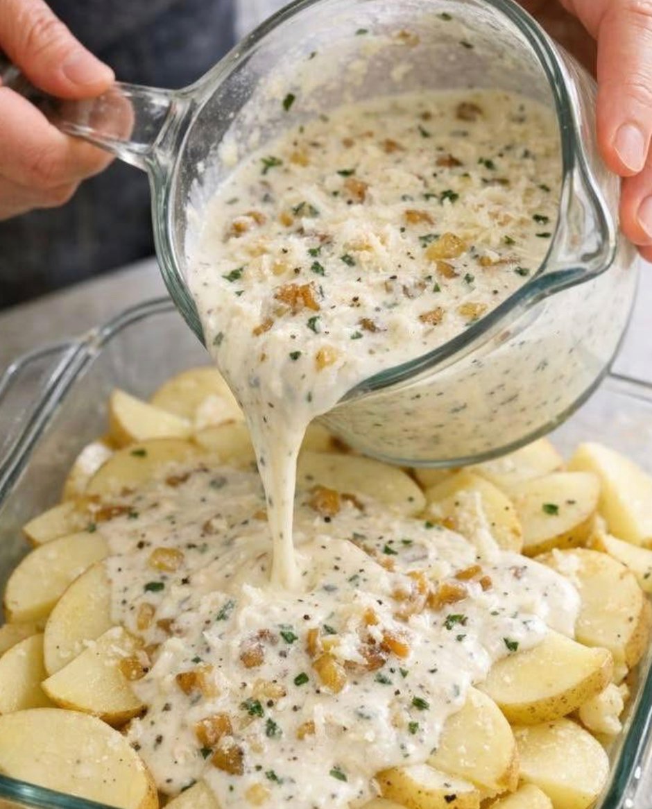 Pour the sauce evenly over the sliced potatoes, making sure all slices are coated. Gently shake the dish or use a spoon to nudge the sauce between the layers.