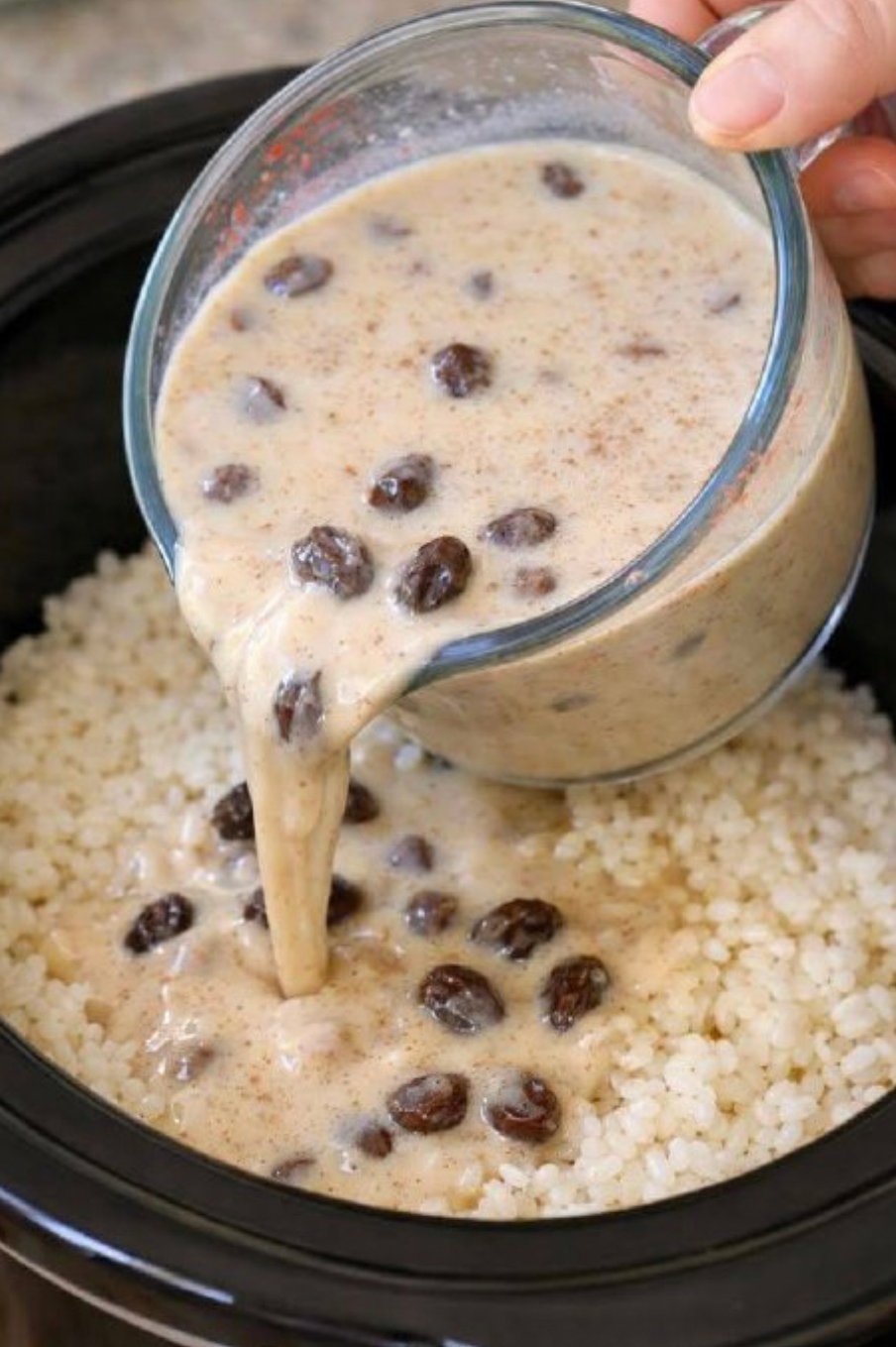 Carefully pour the creamy liquid mixture over the rice in the slow cooker.