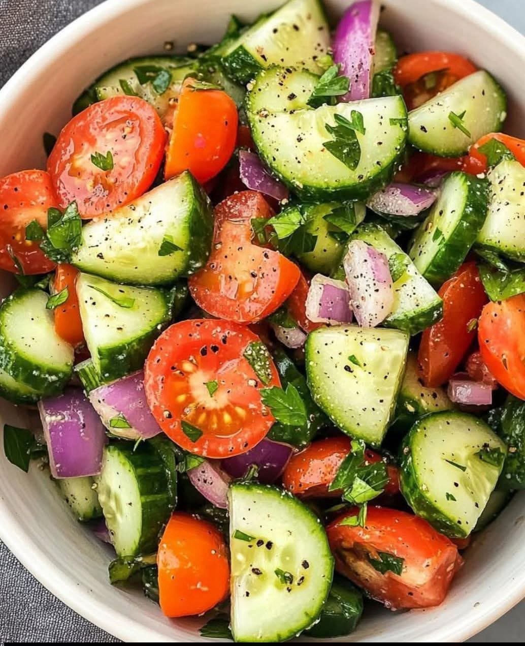 There are salads that are good, and then there is fresh cucumber tomato salad—the kind of simple, vibrant dish that tastes like summer in a bowl. This salad is a celebration of peak-season produce: crisp, cool cucumbers; juicy, sweet tomatoes; and tangy red onions, all tossed in a light, herby vinaigrette. It is refreshing, healthy, and incredibly easy to make. It is the perfect side dish for grilled meats, sandwiches, or a light lunch on a hot day.