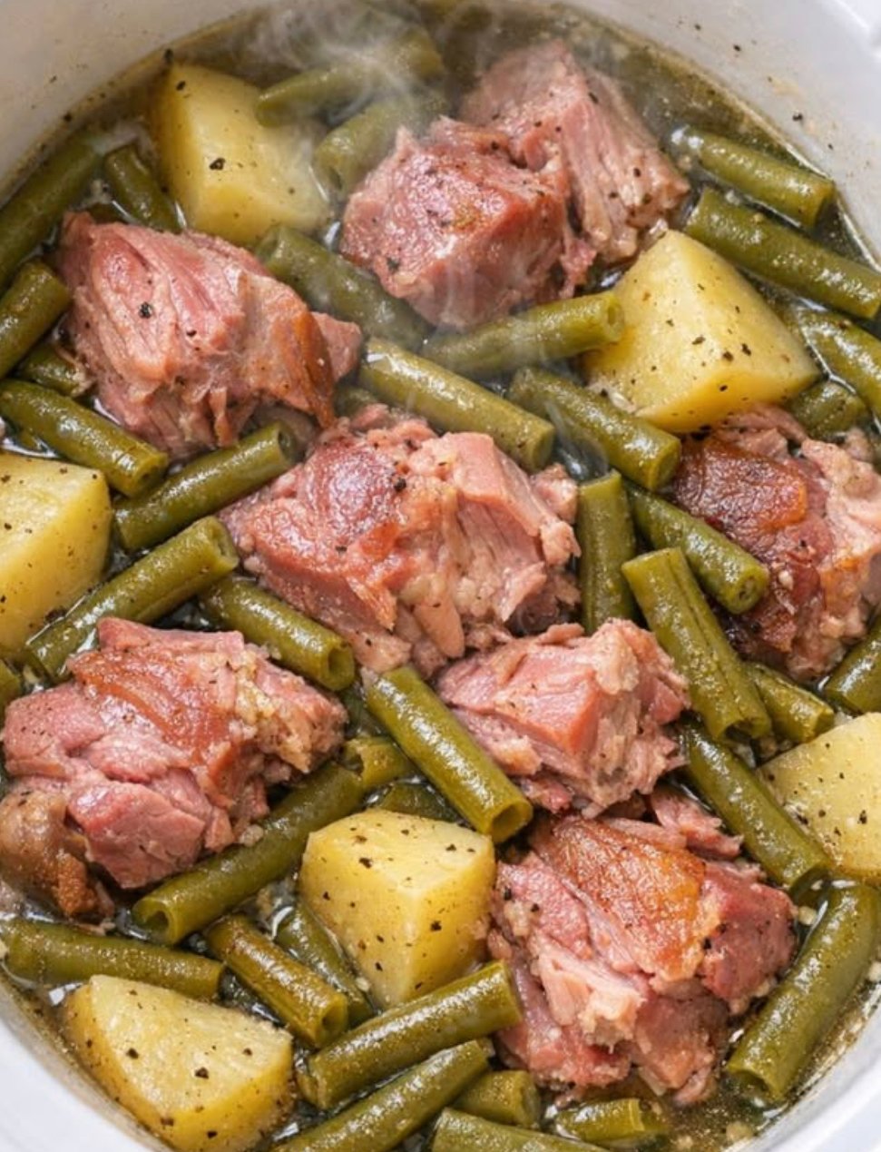 Ham, green beans, and potatoes is a classic dish that has deep roots in Southern and farmhouse cooking. It emerged as a way to stretch a small amount of meat (often smoked ham or bacon) into a filling meal using affordable, readily available vegetables.