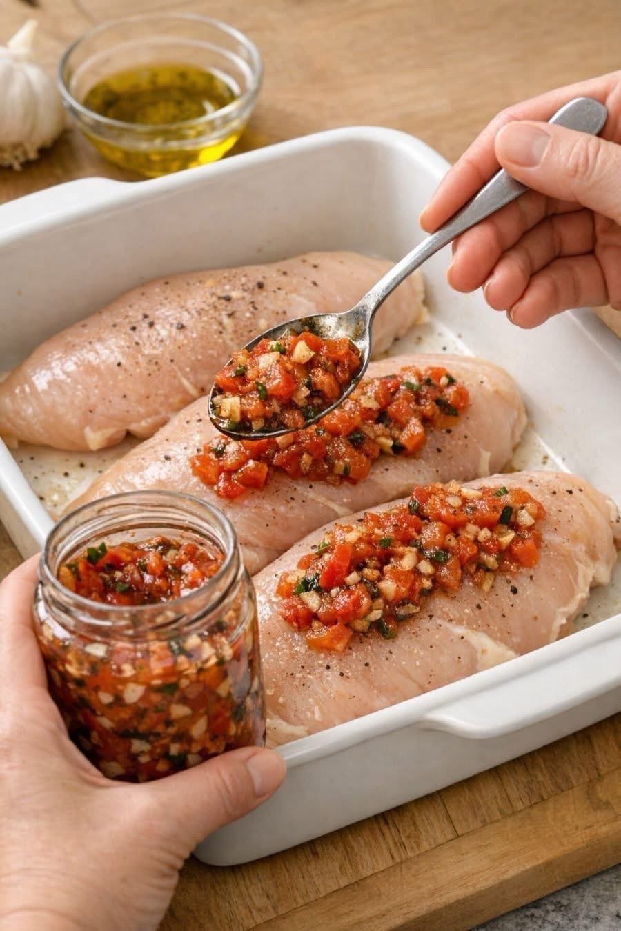 Spoon the bruschetta topping evenly over each chicken breast, spreading to cover the surface.