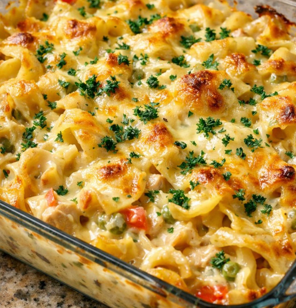 Oven-Baked 4-Ingredient Amish Chicken à la King Noodles: The Easiest Creamy Casserole You’ll Ever Make