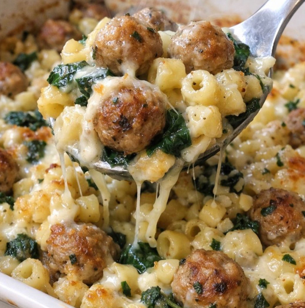 The dry pasta cooks directly in the broth, absorbing all that savory flavor. The frozen mini meatballs become tender and juicy. The fresh spinach wilts into silky, green strands. And the whole thing bakes together into a bubbling, golden-topped casserole that tastes like it came from Grandma’s kitchen.