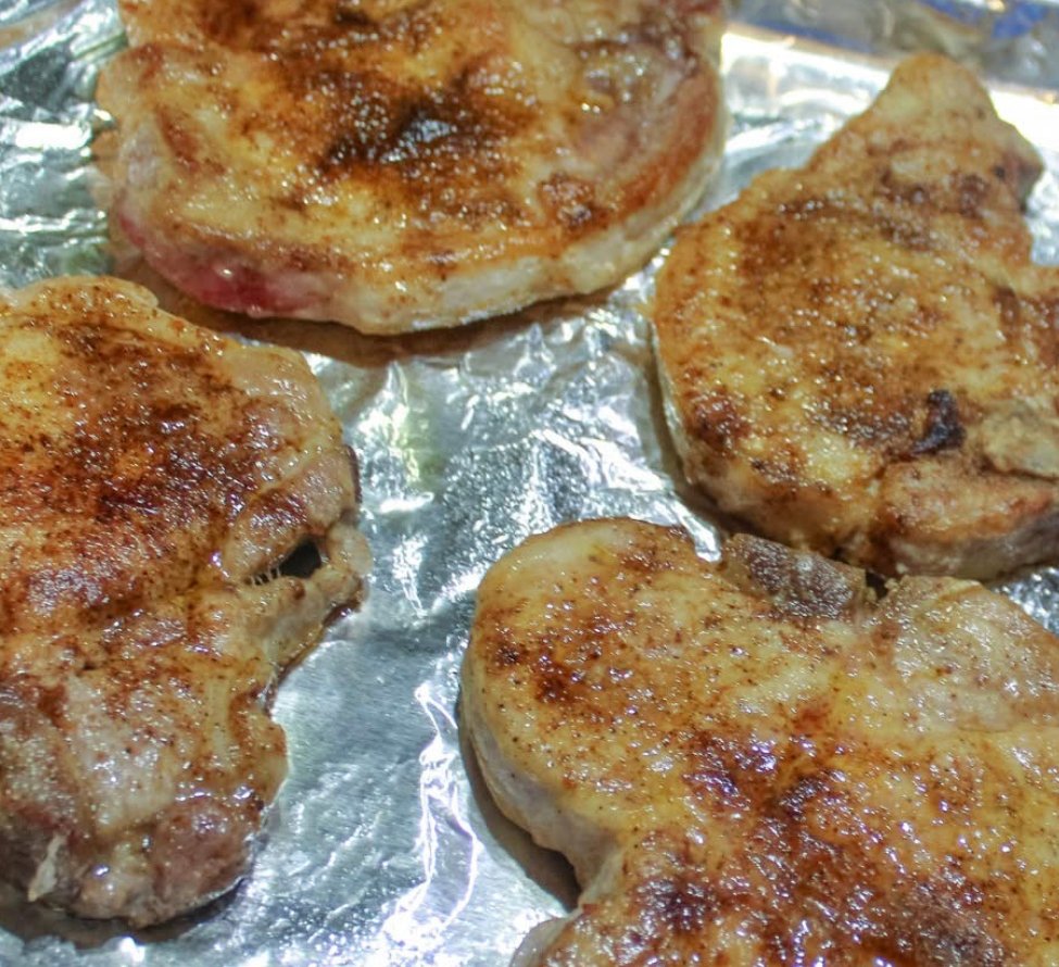 Place the seared pork chops on a baking sheet. You can spray the baking sheet with oil, but it is not necessary unless the pork is very lean.