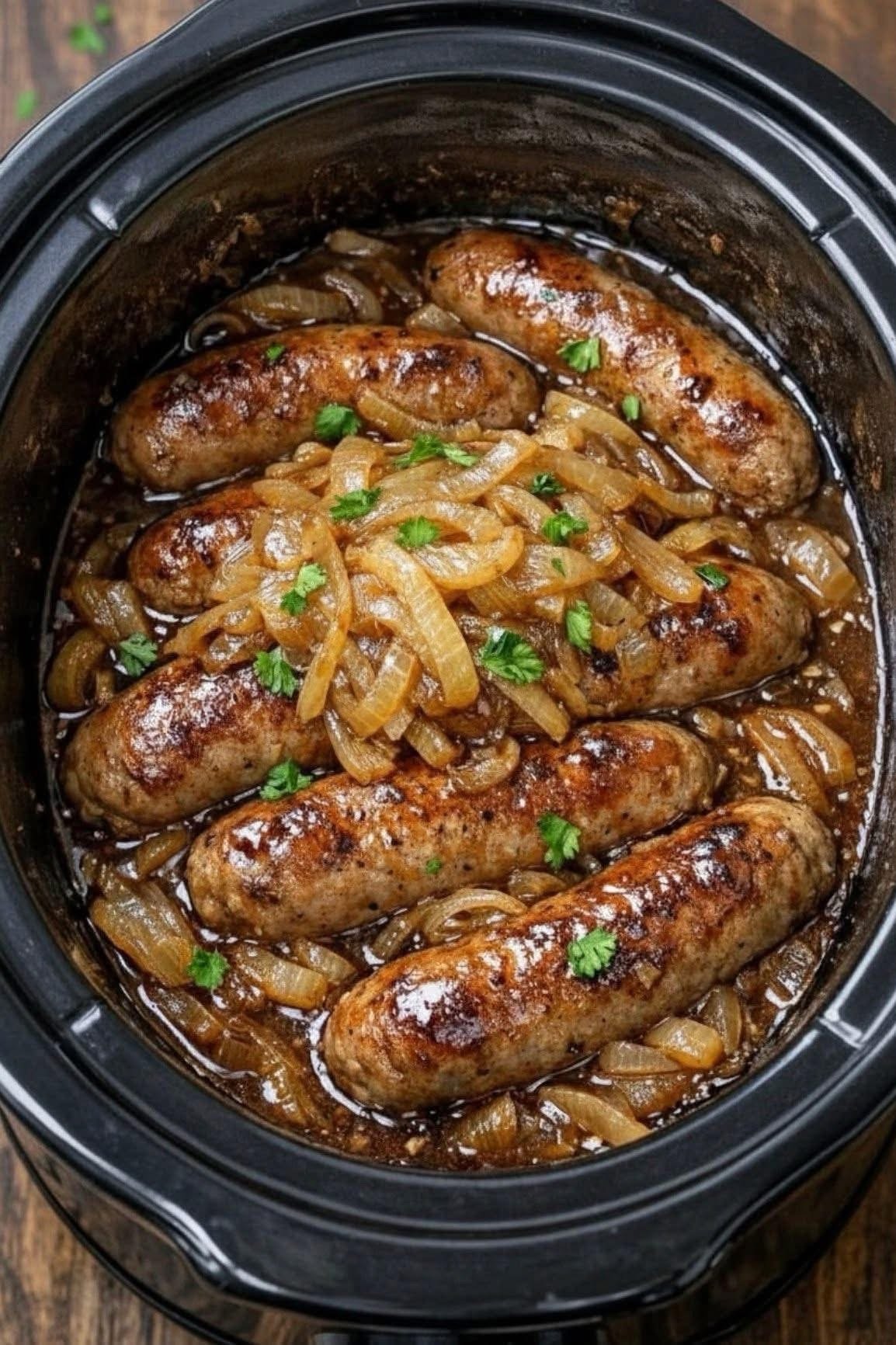 You can caramelize onions in a slow cooker on LOW for 8 to 10 hours, but they will be very soft and not have the same browned edges as stovetop caramelized onions. Cook the sausages separately.