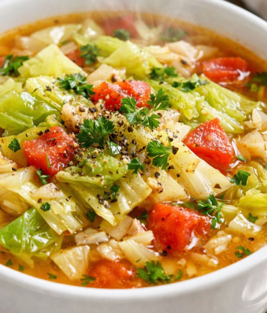 The slow cooker does all the work. The cabbage becomes tender and sweet, the tomatoes add brightness, and the onion melts into the broth.