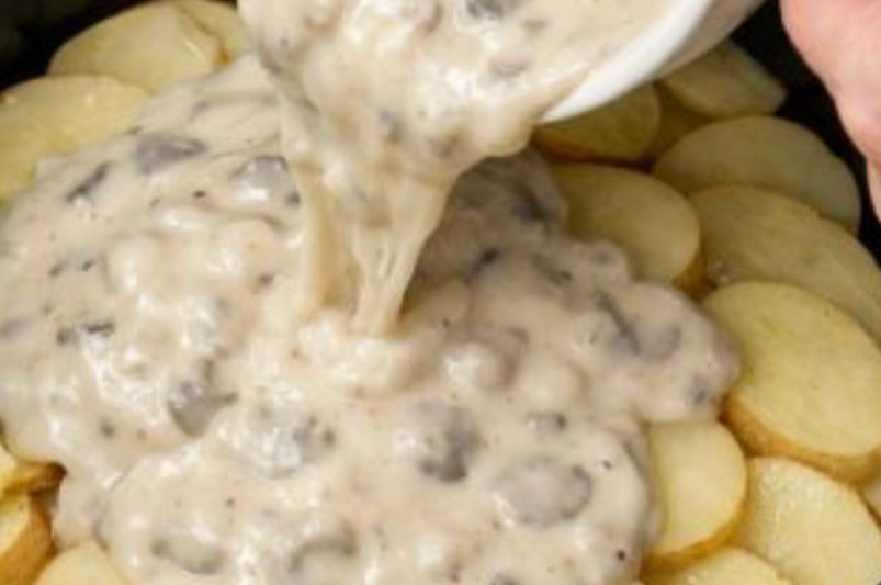 Slowly pour the cream of mushroom mixture evenly over the top of the layered potatoes and ham, making sure to cover as much of the surface as possible. Gently tap the slow cooker on the counter or use the back of a spoon to nudge the top layer so the sauce settles down between the slices.