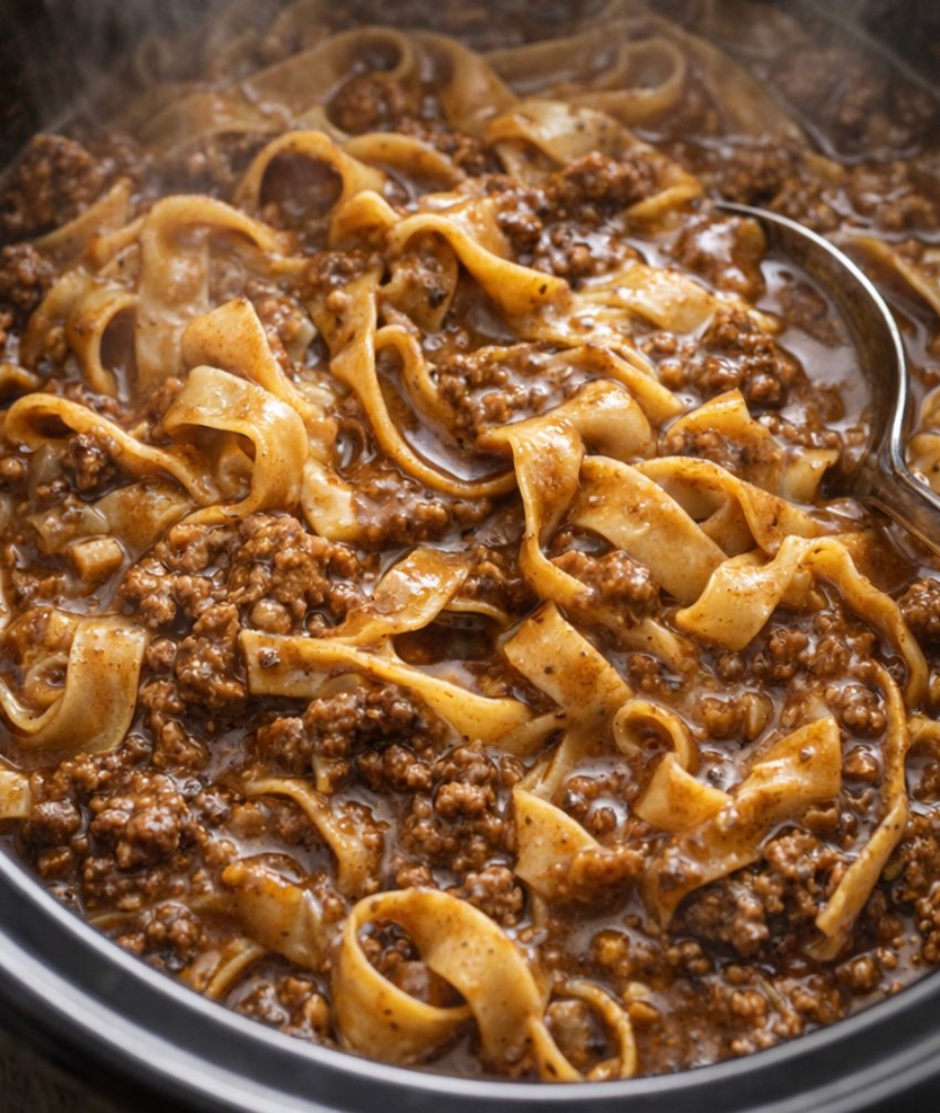 Ground beef, brown gravy mix, beef broth, and wide egg noodles — that’s all it takes. The slow cooker does all the work, transforming the beef into a tender, flavorful base while the gravy thickens into a rich, silky sauce. Add the noodles at the end, and you have a complete meal in one pot.