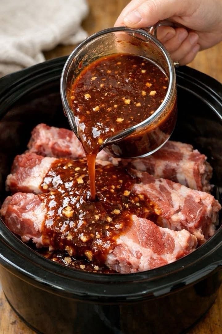 Place the seasoned ribs in the slow cooker, standing them up along the sides if needed or laying them flat in layers. Pour the cherry cola sauce over the ribs, making sure they are well coated. (You can reserve about ½ cup of sauce for later if you want extra for serving.)