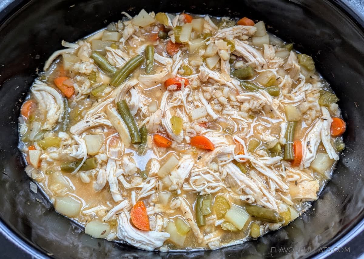 Remove the chicken from the slow cooker and transfer to a cutting board. Use two forks to shred the chicken into bite-sized pieces. Return the shredded chicken to the stew.