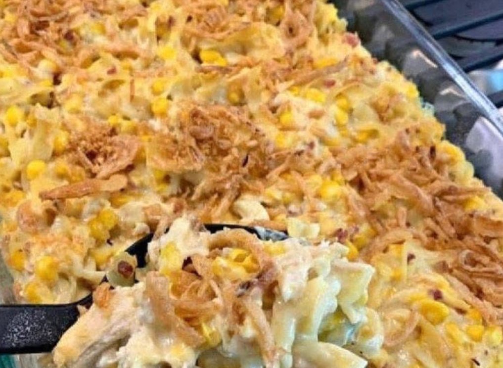 Creamy noodles, tender chicken, sweet corn, smoky bacon, melty cheese, and crispy fried onions — all baked together into golden, bubbly perfection. It’s comfort food at its finest.